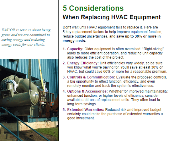 Energy Tips Subscribe to our quarterly energy tips. An Action Plan for Consistent Energy Savings Find Out If Your Energy Costs Are Too High. Identify Up To 15% In Energy Savings! Follow This Simple Roadmap To Energy Savings. Identify A Path To Savings. Up To 30% Of A Building's Energy Consumption Is Wasted 5 Considerations When Replacing HVAC Equipment. R-22 Phase Out - 3 Options For Building Owners.